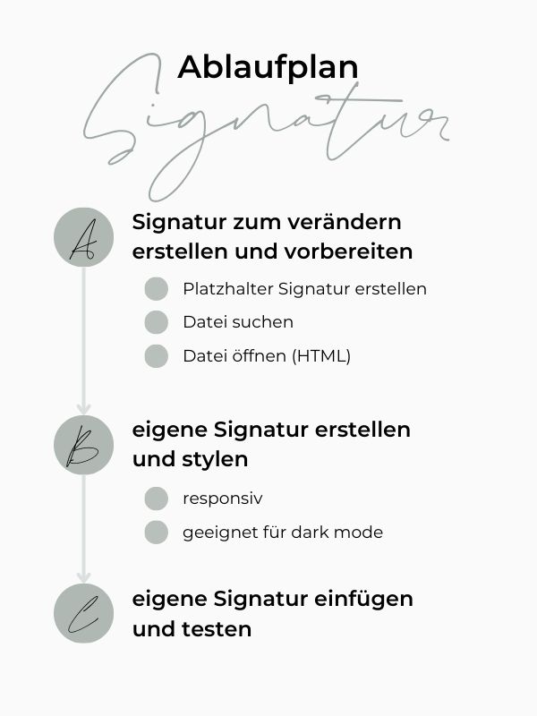 Puh, das war jetzt ganz schön viel oder? Aber eine Signatur kann dein Branding super ergänzen. Sie ist mehr als ein hübscher Abschluss. Sie repräsentiert dich und deine Marke, sorgt für einen professionellen Eindruck und kann sogar neue Kontakte oder Kund:innen anziehen. Hier findest du nochmal den Ablauf zum Erstellen der Signatur in zehn Schritten zusammengefasst: