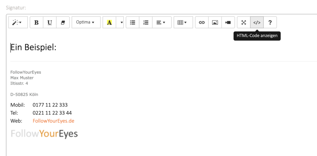 - Nutze einen Generator wie diesen hier: https://followyoureyes.de/blog/email-client-signatur-online-erstellen
