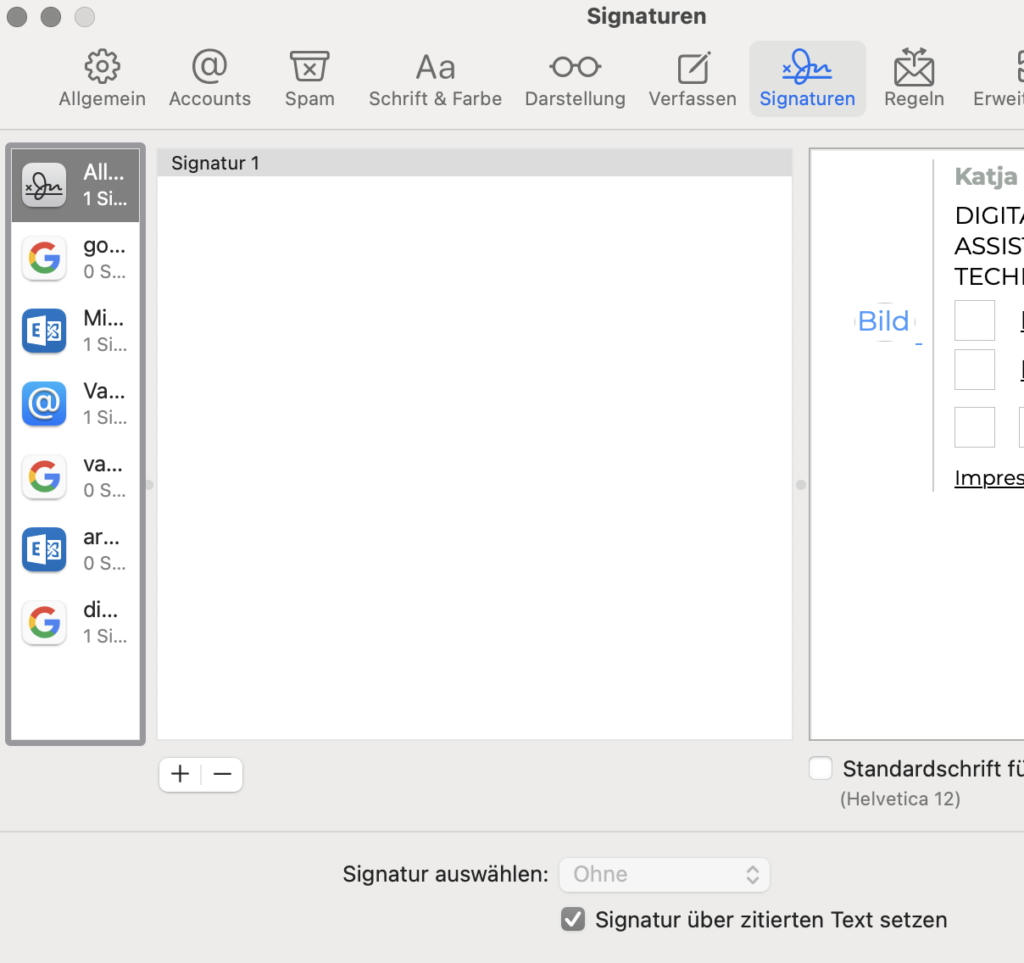Speichere die veränderte Datei (Cmd+s) und setze das Häkchen wieder bei „geschützt“. Dieser Schritt ist tatsächlich wichtig. Nun kannst du testen und das Mailprogramm öffnen und eine E-Mail verfassen und die Signatur auswählen. Oder du wählst sie standardmäßig aus. Schiebe sie einfach zum entsprechenden Account und wähle sie dann im Reiter aus (siehe Bild). Erfahrungsgemäß muss man ein bisschen probieren, bis alles passt. Vergiss dabei nicht, dass du Mac Mail vorher schließt und das Häkchen für die Signatur-Datei beim Bearbeiten immer bei “geschützt” entfernst bzw. dann wieder hinzufügst, bevor du testest.