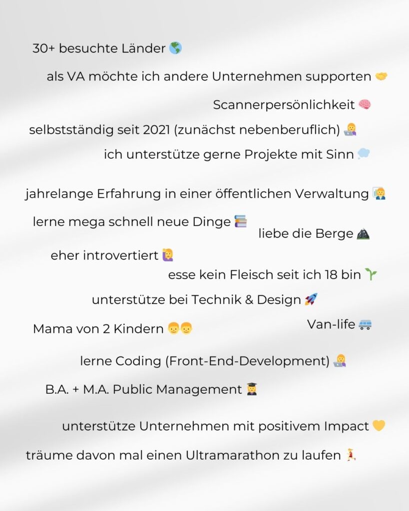 Hi, ich bin Katja – Webdesignerin und Virtuelle Assistentin. Ich liebe es, im Hintergrund die Fäden zu ziehen und anderen dabei zu helfen, ihre Vision sichtbar zu machen. Dabei verbinde ich kreative Gestaltung, smarte Technik und ein gutes Gespür für das große Ganze. Doch hinter meinem Business steckt noch viel mehr: eine Leidenschaft für Menschen, die Positives in die Welt bringen wollen, eine große Portion Abenteuerlust und der Wunsch, Arbeit und Leben so zu gestalten, dass sie mich wirklich erfüllen. Mir fällt es ganz schön schwer, diesen Blogpost so öffentlich zu teilen, da es sehr ungewohnt ist, so viel von sich preiszugeben. Aber ich möchte auch nur mit den Menschen zusammen arbeiten, die meine Visionen teilen und mit mir auf einer Wellenlänge sind.